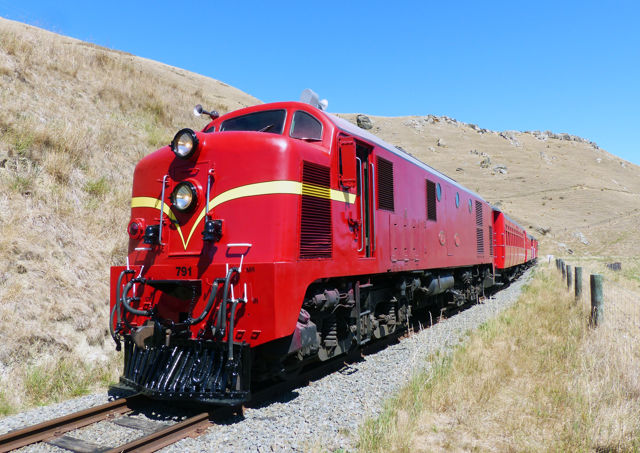 Close up of red train passing through hills