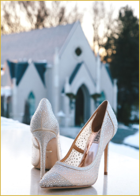 Bridal shoes with church in background