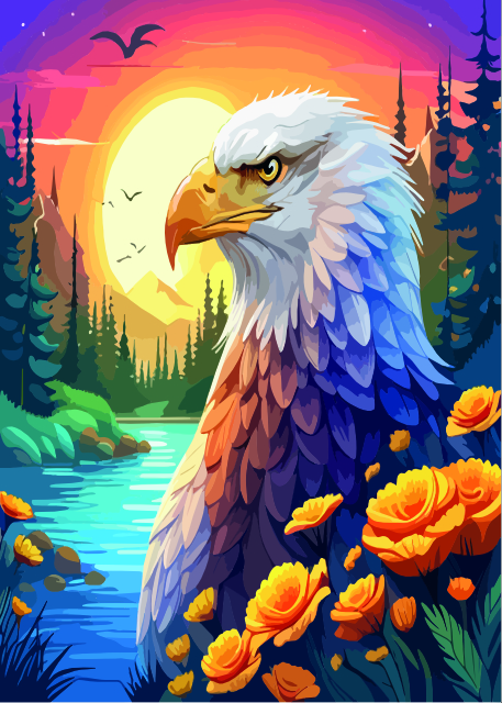Eagle with river and trees with flowers